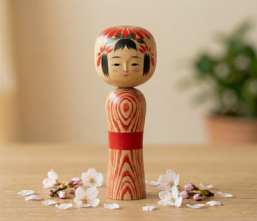 It is a type of the most popular Kokeshi. The workers paint the head with a beautiful red circle pattern, which looks like a hair ornament. The body is also thin and has sloping shoulders.