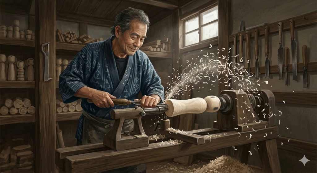 The workers of the Kokeshi use a rolling device to secure the wood and shape it. Thus, they utilize a wheel device for this process. Yes. It is Rokuro.