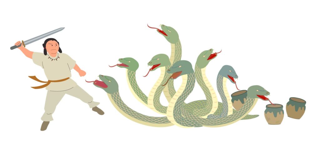 His plan worked. Yamata no Orochi became intoxicated and fell into a deep sleep. The fortune was on his side! He cut the eight heads down and subjugated the monster.